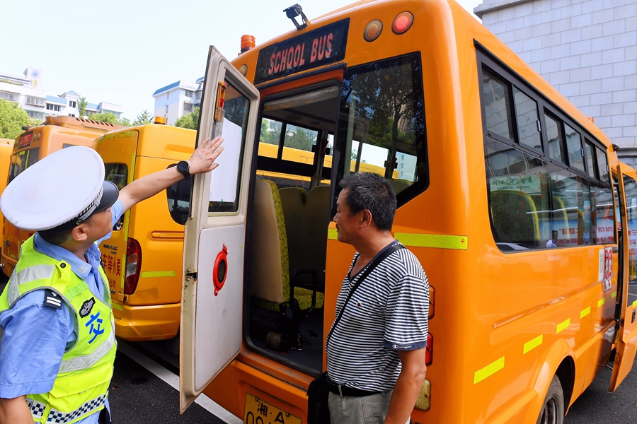 9月4日,長沙市芙蓉區(qū)政府停車坪,交警對校車進行安全檢查。當(dāng)天,長沙交警開展“校車安全大檢查”專項行動,對全市校車公司負責(zé)人、安全員、校車駕駛員、校車照管員等開展交通安全教育,對校車車況、車內(nèi)的安全設(shè)施配備等進行檢查,排查安全隱患。